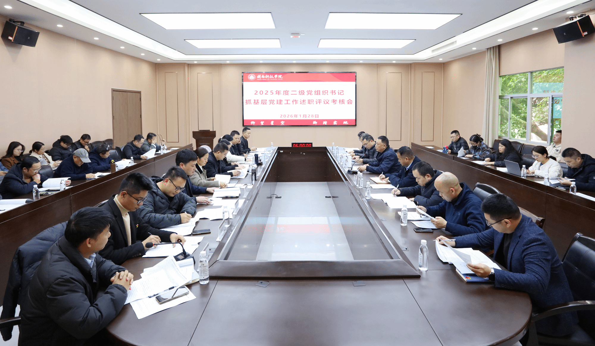 1月28日,我校召开2025年度二级党组织书记抓基层党建工作述职评议考核会议。校党委书记李旭主持会议并讲话。校领导班子成员,校长助理,校党委委员、纪委委员,行政职能部门负责人、二级学院党政主要负责人,各述职单位党员代表、工会委员代表、校学生会学生代表参加会议。